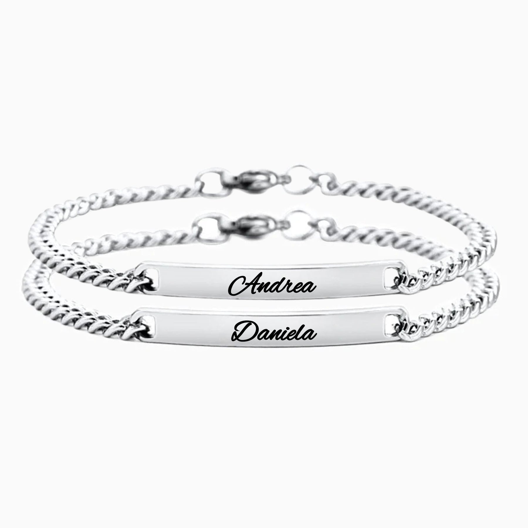 Diese Freundschaftsarmbänder aus hochwertigem 316L Edelstahl stehen für Verbundenheit und Zusammenhalt. Die beiden Armbänder sind jeweils mit einer glatten Gravurplatte versehen, die individuell mit Namen oder einem persönlichen Wort graviert ist. Durch das schlichte und zeitlose Design in Silber eignen sie sich perfekt als Geschenk für beste Freunde, Schwestern oder besondere Herzensmenschen.