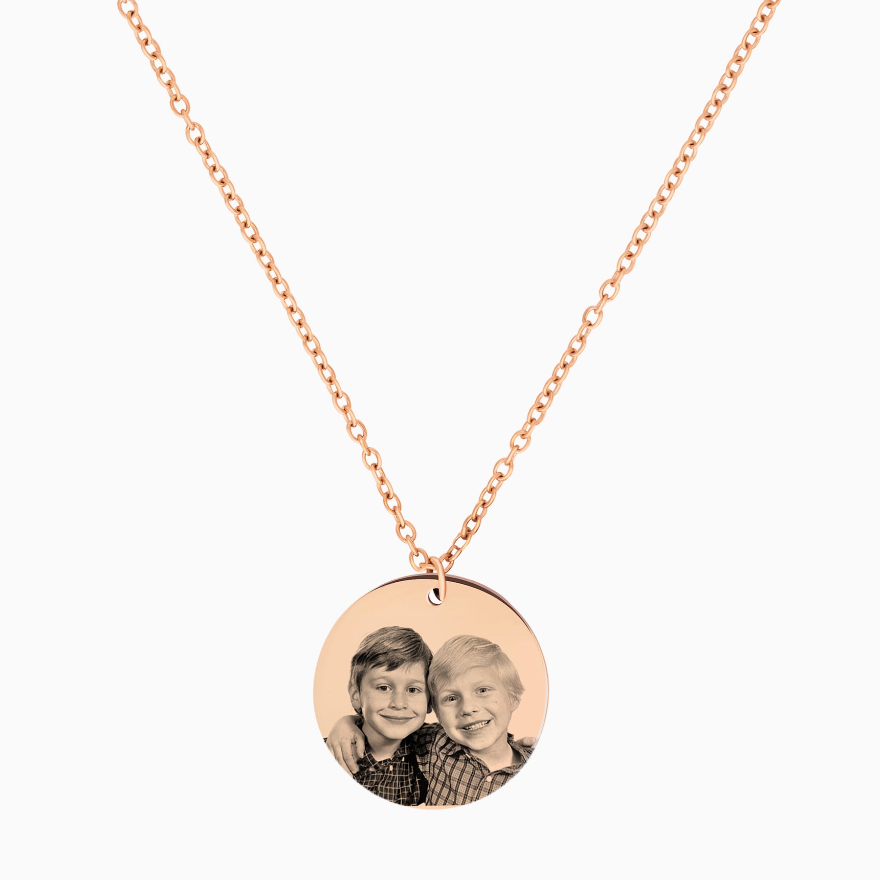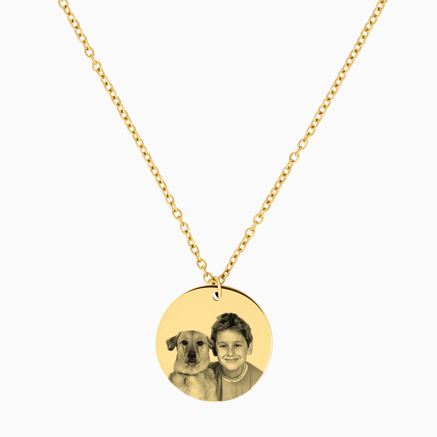 Halte einen besonderen Menschen oder Deinen treuen Vierbeiner immer ganz nah bei Dir. Diese hochwertige Halskette mit rundem Anhänger wird mit Deinem Wunschfoto detailgenau graviert. Das Ergebnis ist ein edles, langlebiges Erinnerungsstück, das Dich überall begleitet.